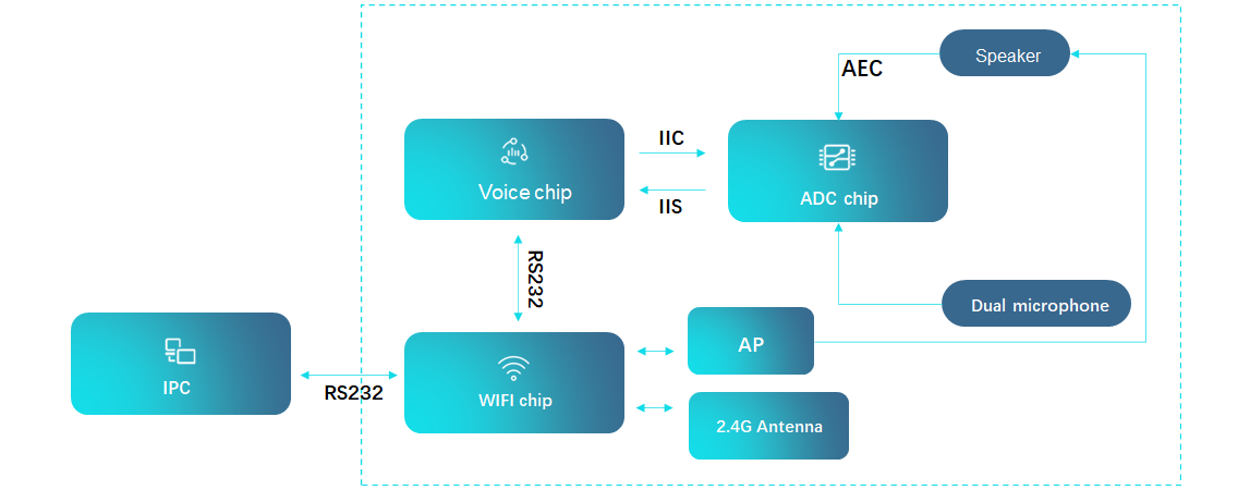Single product built-inThe terminal product is internally integrated with an offline voice recognition chip, which is connected to the original electronic control system of the product through a communication bus to achieve voice control function. -